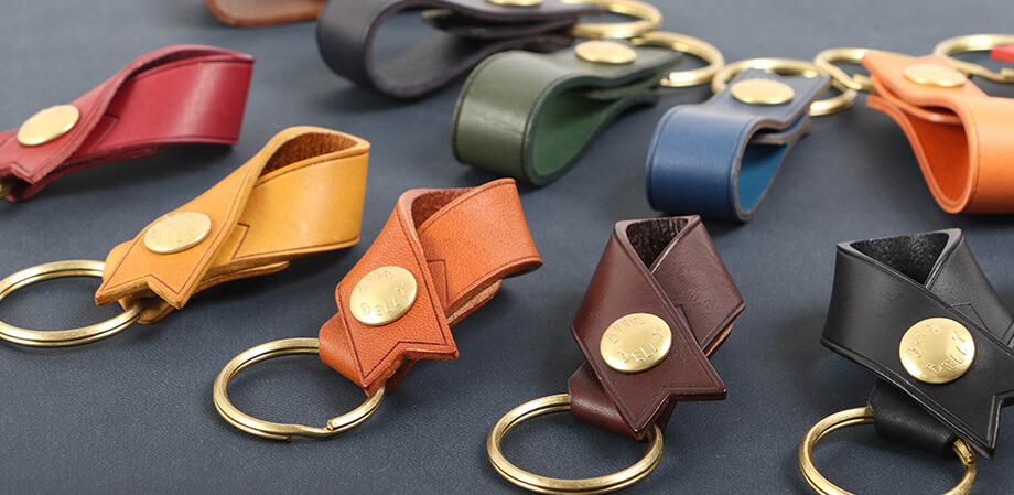 革の端がリボンのデザインとなっておりベルトにさげることでTシャツの裾からリボンが少し出ているように見える遊び心満載のキーホルダー。