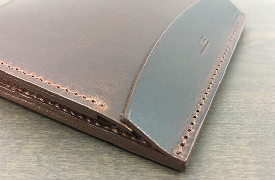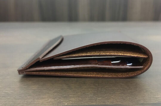 留め具部分はボタンなどの金具ではなく革のしなりで留めるようなデザインになっており、スマートで持ち心地のよいマネークリップです。