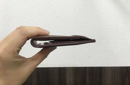 縦横9.5cmと厚みは0.5cm~1.5cmです。使うほどに、革は馴染みペタンとよりスリムに経年変化してゆきます。ジャケットのぽけっとにもさっと入れて持ち歩けるサイズ感。