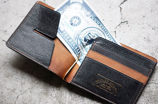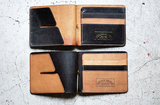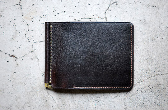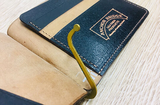 スマートかつ無骨な表情も持つホーウィン社のホースレザー。銀面(革の表面)と床面(革の裏面)の双方の表情が楽しめるアンカーブリッジのマネークリップ。