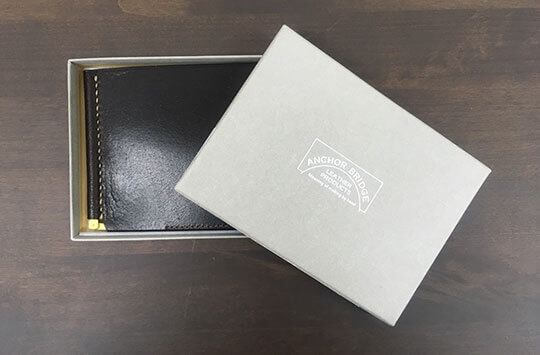大きさに合わせた化粧箱に入っております。グレーの化粧箱にはアンカーブリッジのロゴマークが打刻されており、おしゃれなプレゼントとしてお渡しできます。