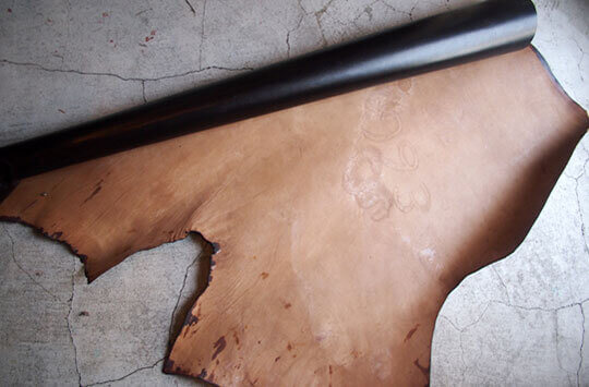 チョコ 床面(革の裏面)に染料を塗り込みプレスしたワイルドな表情が魅力的なチョコカラー。屈曲し揉みこまれることで下地のヌメ色が現れ独特な質感が生まれます。